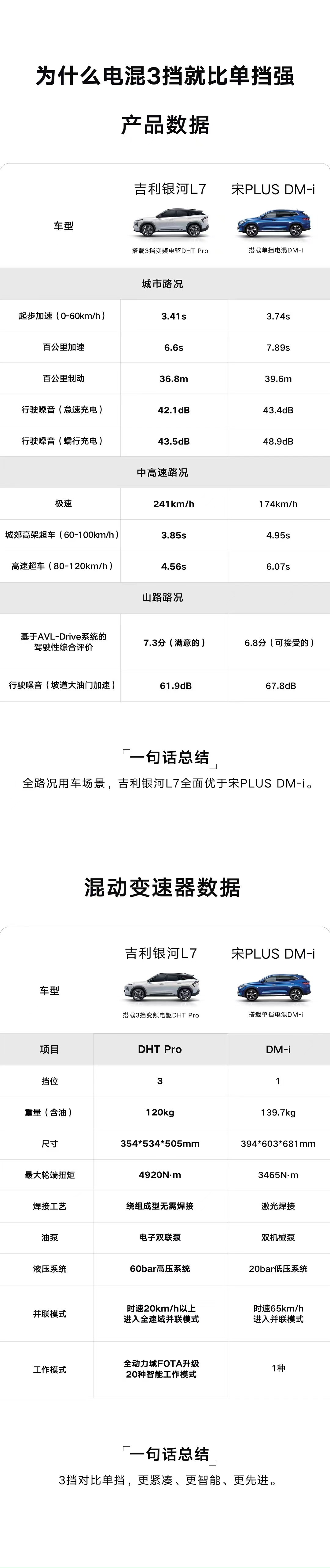 此外,在“全域三挡”技术加持下,3挡变频电驱DHT Pro还可以激发P1电机“超频模式“,持续输出更强的动力,实现综合最大功率287kW,获得媲美性能车的持续加速能力。银河L7的实测极速高达241km/h,相比单挡DHT电混车型仅为170~180km/h的极速,领先优势明显。