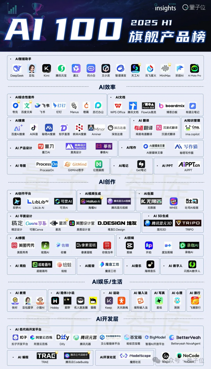 据量子位智库介绍,这份AI产品观察体系由“旗舰100”和“创新100”两个榜单组成,其中“旗舰100”代表当前格局中的领军阵营,“创新100”代表未来市场的种子选手。